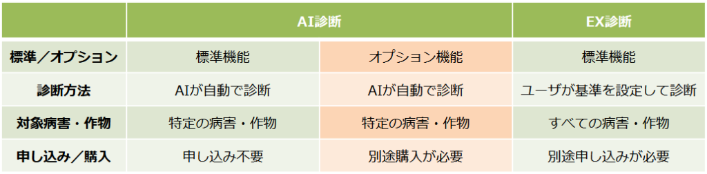 HeSo+では、病害や作物の発病ポテンシャルを診断するため、「AI診断」と「EX診断」の2種類の機能を提供しています。