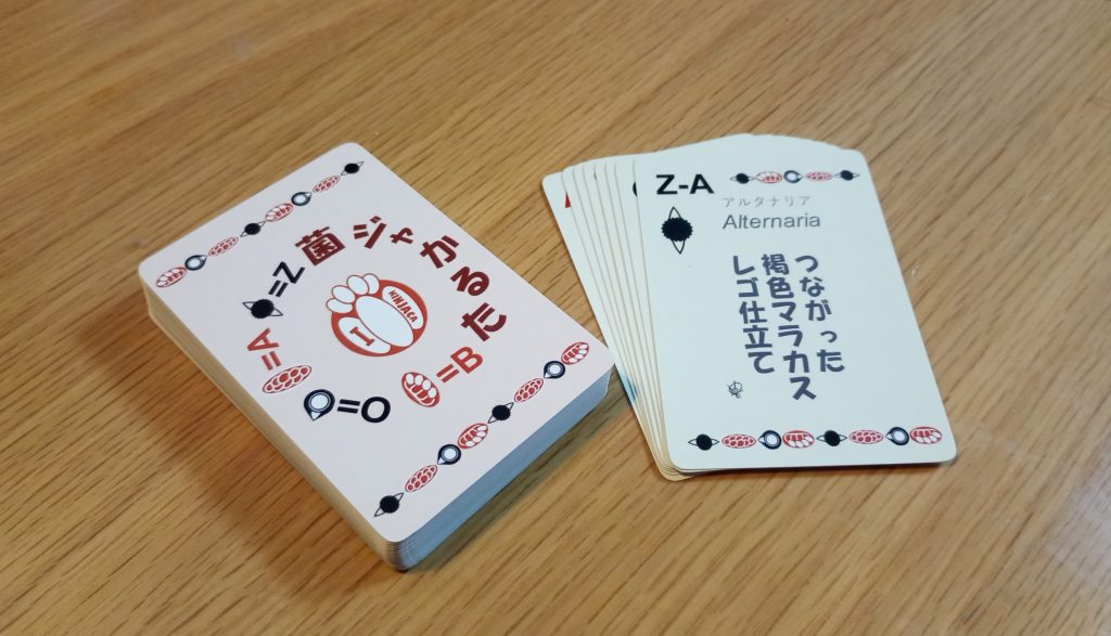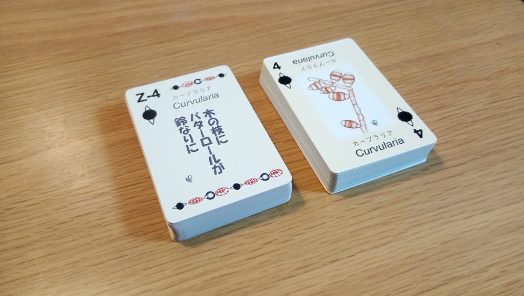 菌ジャカの第二弾『菌ジャカⅡ』を作成しました。菌ジャカⅡも菌ジャカ第一弾と同様に、主に農研機構の農業生物資源ジーンバンク事業で公開している写真をもとに、植物病原菌類(カビの仲間)の15属(属=近縁種から成る分類群)を描いた図を印刷したものです。第一弾とは別の属をトランプにしました。ぜひ、多くの方に購入していただき、第一弾、第二弾で遊んでいただけたらと思います。