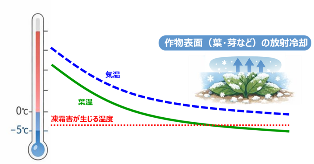 図の途中に示されている赤い点線は、「凍霜害が生じる温度」を表しています。これは、作物が生理的に耐えられる温度の境界を示す概念的な線であり、葉温がこの境界を下回れば、凍霜害のリスクは高まります。この「凍霜害が生じる温度」は、作物の種類や生育段階によって異なります。ここで、重要なのは、この境界を越えるかどうかを決めているのが、気温ではなく、作物体の温度であるという点です。気温が0℃以上であっても、作物体の温度がこの「凍霜害が生じる温度」を下回れば、凍霜害のリスクは高くなります。