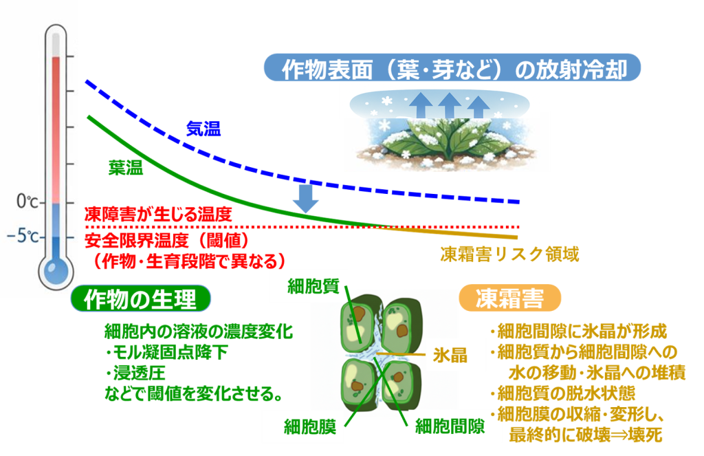 図5.凍霜害の概念図.放射冷却によって作物表面(葉・芽など)が冷え,葉温が安全限界温度に達すると,細胞レベルで凍結が起こり,凍霜害として現れる.凍霜害は,大気ではなく、作物そのものが冷えることで生じる現象である.