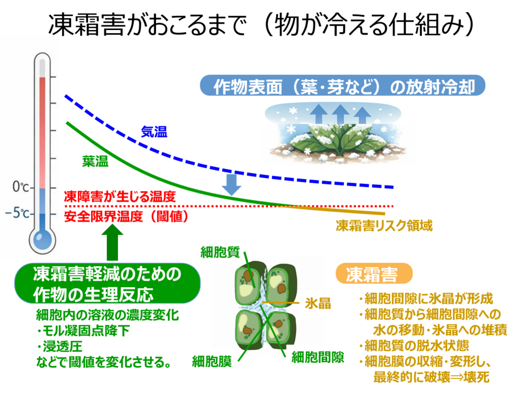 図5.凍霜害の概念図.放射冷却によって作物表面(葉・芽など)が冷え,葉温が安全限界温度に達すると,細胞レベルで凍結が起こり,凍霜害として現れる.凍霜害は,大気ではなく、作物そのものが冷えることで生じる現象である.