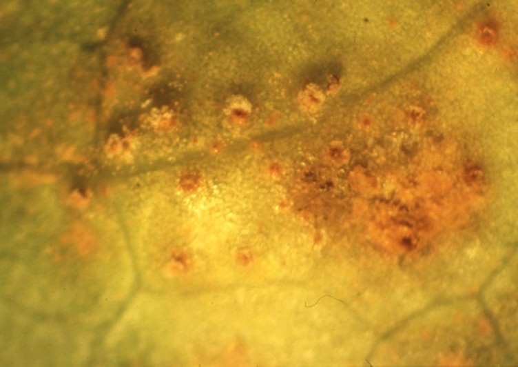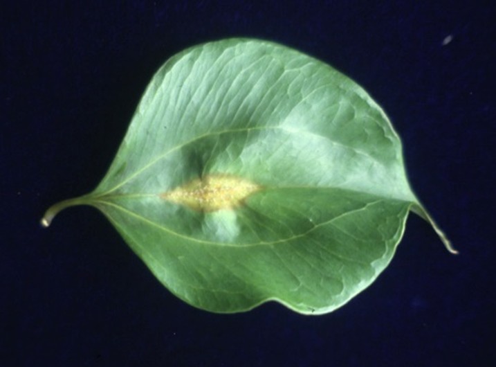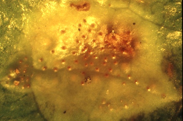 図2.トキワサルトリイバラの葉裏のさび胞子堆(銹子腔).