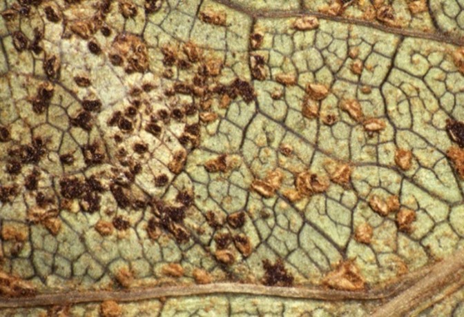 図5.ムニンハマウドさび病菌の夏胞子堆(淡褐色)と冬胞子堆(暗褐色).