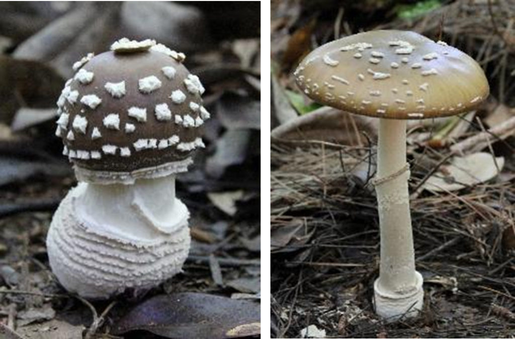 図2.毒キノコの1種テングタケの未熟子実体(左)と成熟子実体(右)