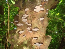 図3.シマホルトの幹に発生したサルノコシカケ科Ganoderma属の硬質キノコ(子実体)