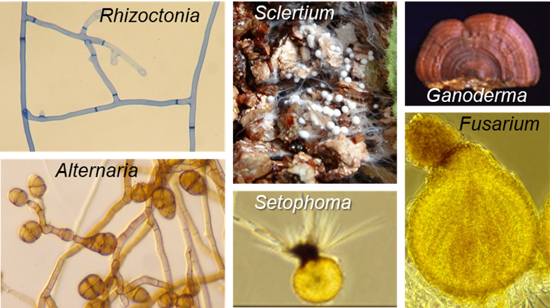 図4.隔壁のある菌類の菌糸や器官.左上:Rhizoctonia属菌(担子菌類)の菌糸(アニリンブルー染色),左下:Alternaria属菌(子のう菌類)の分生子,中上:Sclerotium (Agroathelia) rolfsii(担子菌類)の白い未熟菌核,中下:Setophoma属菌(子のう菌類)の分生子殻,右上:Ganoderma属菌(担子菌類)の子実体,右下:Fusarium属(Neocosmospora属、子のう菌類)の子のう殻.