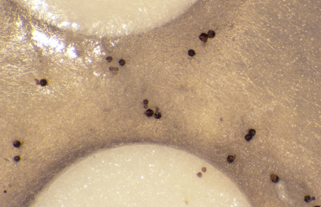 図5.貧栄養培地にろ紙片(白い部分)を加えた培地上で形成されたFusarium graminearumの子のう殻(有性世代)