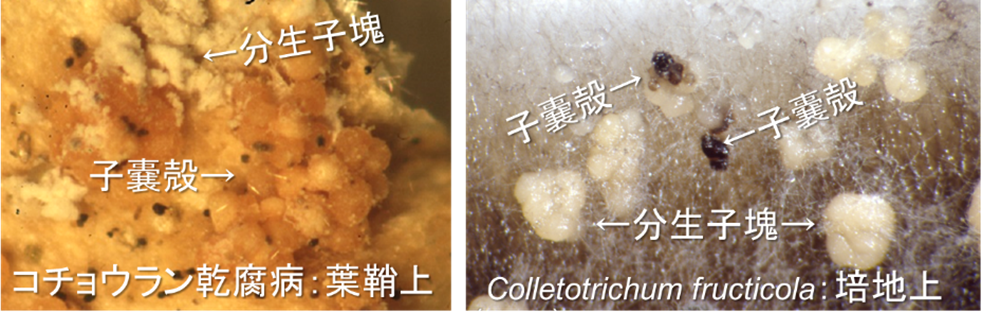 図6.左:コチョウラン乾腐病菌(Clonostachys rosea)が宿主の葉の上で形成した球形子のう殻(有性世代)と白い分生子塊(無性世代)、右:炭疽病菌Colletotrichum fructicolaが培地上で形成した黒い粒状の子のう殻(有性世代)とクリーム色の分生子塊(無性世代)